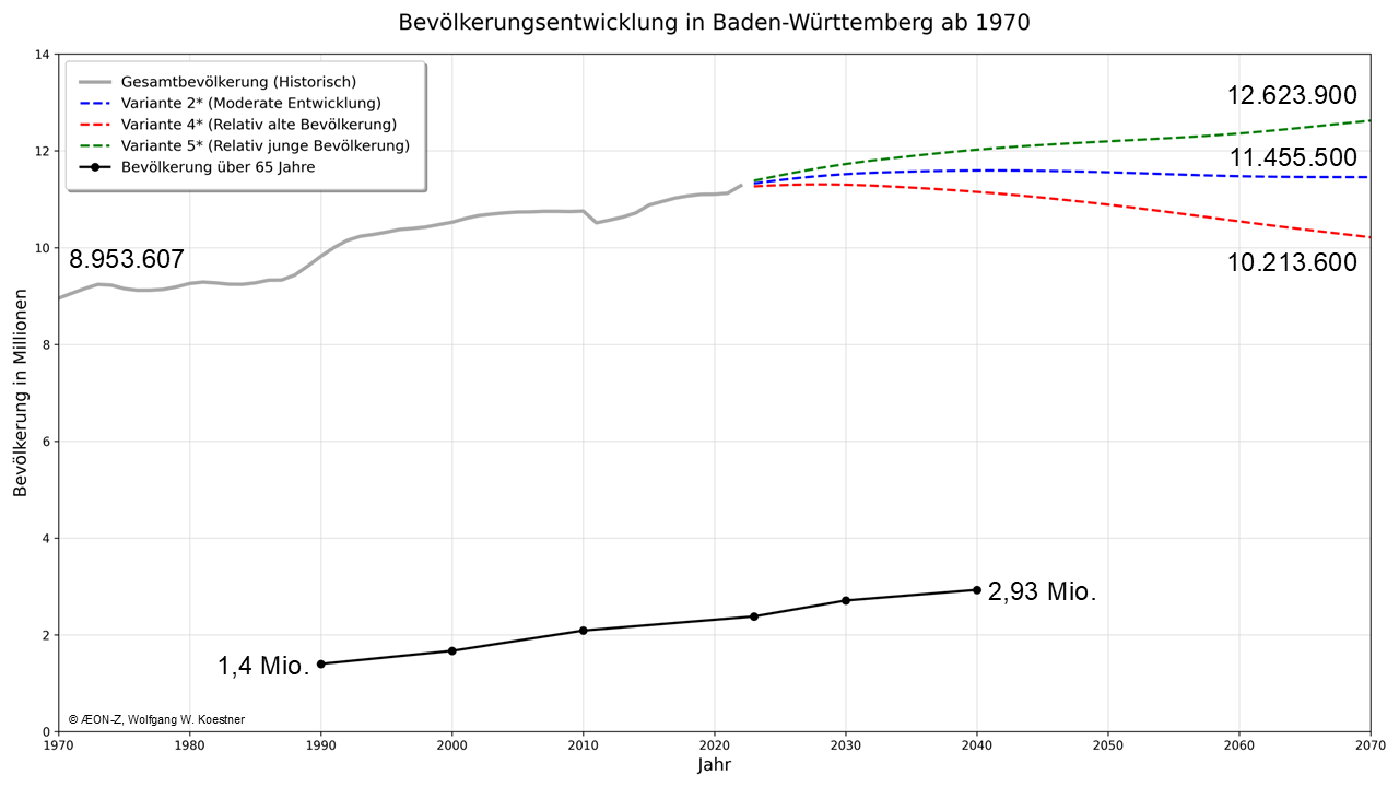Diagramm: Bevölkerungsentwicklung in Baden-Württemberg (1970–2070) zzgl. Entwicklung der Zunahme der über 65-Jährigen. Die Abbildung visualisiert die historische Bevölkerungsentwicklung Baden-Württembergs von 1970 bis 2022 sowie die projizierte Entwicklung bis 2070, ergänzt durch die Entwicklung der Bevölkerungsgruppe der über 65-Jährigen. Die historische Gesamtbevölkerung (graue Linie) startete im Jahr 1970 bei 8,95 Millionen und erreichte im Jahr 2022 einen Wert von 11,28 Millionen Einwohnern. Bevölkerungsprojektionen (2023-2070): Die Projektionen setzen die historische Entwicklung ab dem Jahr 2023 fort und reichen bis 2070. Die Entwicklung der über 65-Jährigen (schwarze Linie unten) zeigt einen kontinuierlichen Anstieg. Im Jahr 1990 umfasste diese Gruppe 1,40 Millionen Personen und wird bis zum Jahr 2040 voraussichtlich auf 2,93 Millionen anwachsen.