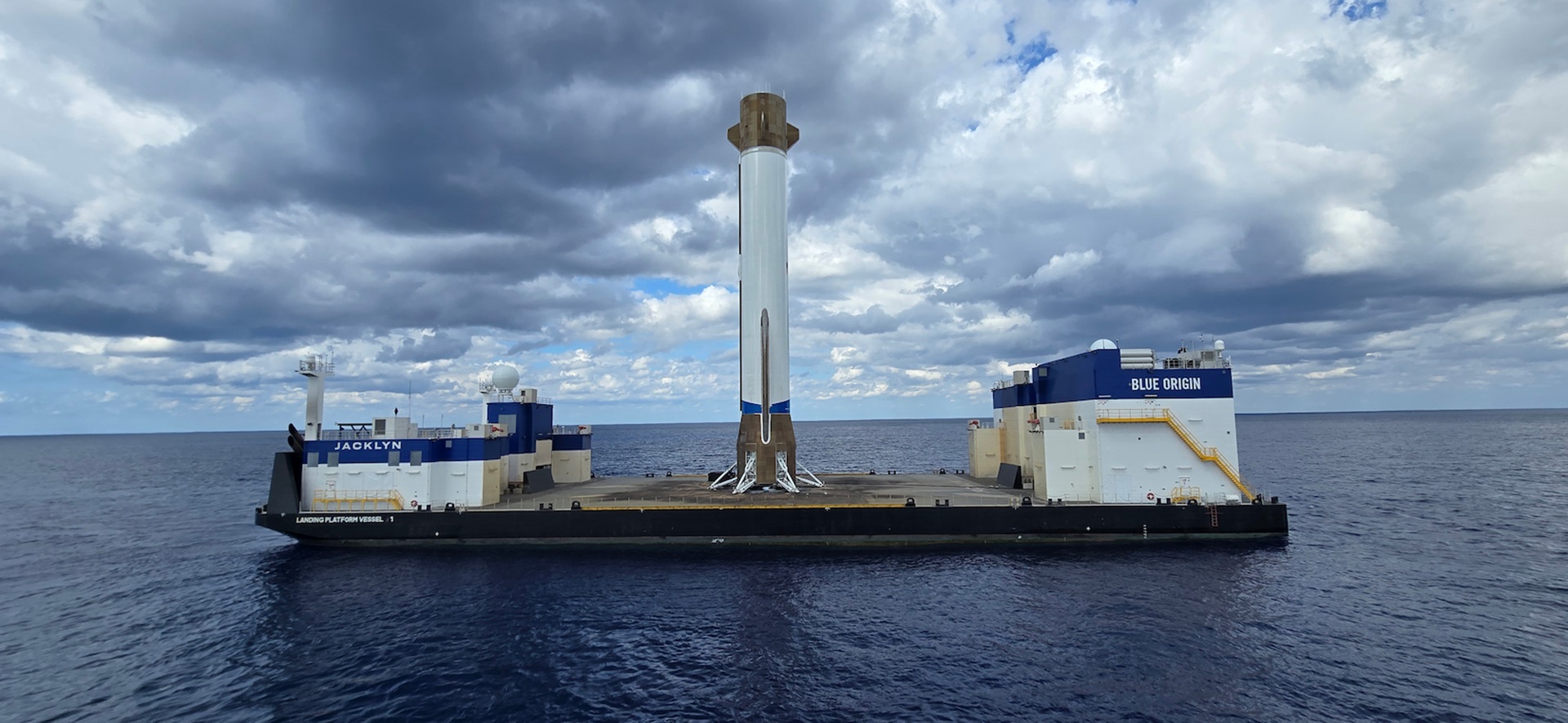 Die sogenannte Boosterstufe, d.h. die erste Stufe der Rakete landete planmäßig auf einer schwimmenden Plattform im Atlantik und kann wiederverwendet werden. Damit wurde zugleich das Monopol von SpaceX gebrochen. © Bild: Blue Origin.