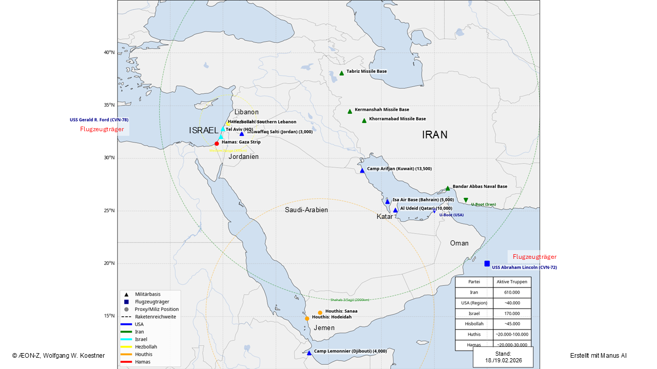 Fazit: Die militärische Infrastruktur für einen schweren Angriff ist de facto aufgebaut. Die Schlüsselfrage der nächsten 2–4 Wochen ist, ob die Genfer »Leitprinzipien« vom 17. Februar in einen tragfähigen Deal münden – oder ob die Deployment-Uhr abläuft, bevor eine diplomatische Lösung steht.